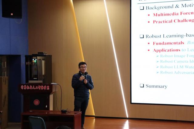 在学术报告环节中,多位专家分享了最新研究成果与实践经验:新加坡南洋理工大学Yonggang Wen(文勇刚)院士的报告“Transforming Data Center Operations and Management with AI”聚焦于人工智能对数据中心运维与管理带来的变革。澳门大学JiantaoZhou(周建涛)教授的报告“Towards Robust Learning-Based Multimedia Forensics”则探讨了基于鲁棒学习的多媒体取证技术在日益数字化且充斥虚假信息环境中的应用前景。澳大利亚悉尼科技大学Jian Zhang(张健)教授、澳大利亚格里菲斯大学ShiruiPan(潘世瑞)教授、LeoZhang(张愉)教授,分别围绕航空成像目标检测、知识图谱赋能可信大模型推理、大模型越狱攻防等领域分享了最新研究进展。这些报告为与会者带来了丰富的学术启发,展示了人工智能技术及其应用的广阔前景。