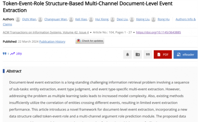 近期,计算机与人工智能学院教师万齐智以第一作者身份投稿的“Token-Event-Role Structure-Based Multi-Channel Document-Level Event Extraction”论文被ACM Transactions on Information Systems(TOIS)收录刊登。该成果是我校在计算机与人工智能领域取得的又一重大进展,是我省截止目前在该期刊的第3篇论文(均来自计算机与人工智能学院数据与知识工程江西省高校重点实验室)。